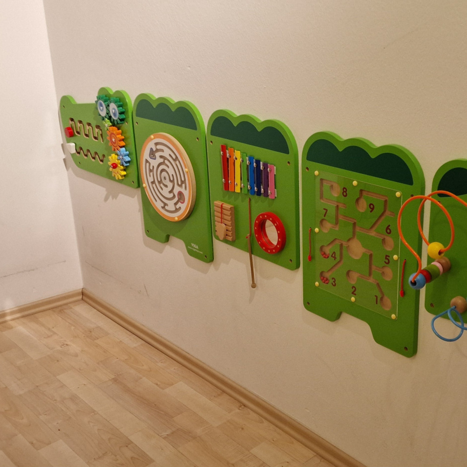 Eine Wand mit Drehscheiben, eine Kugelbahnen und verschiedene Kombination aus Zahnrädern und Hebeln